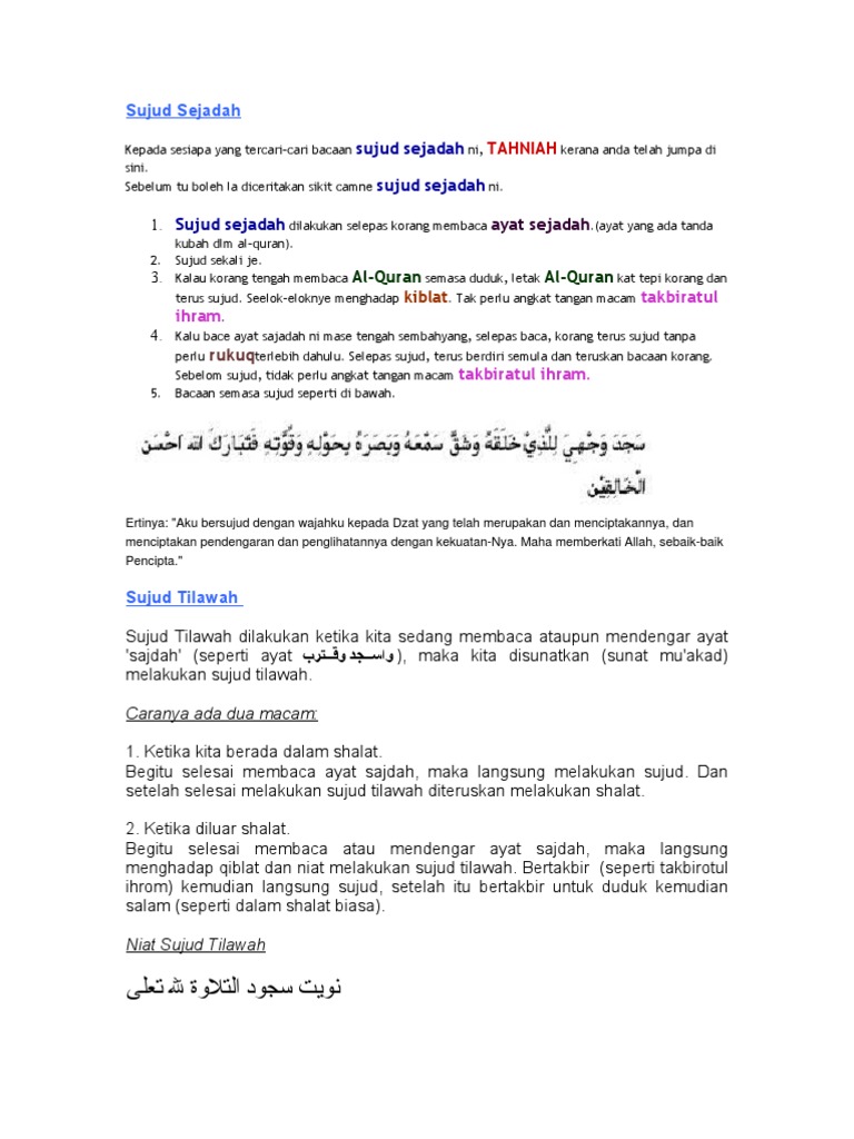 Http Www Kheu Gov Bn Sitecollectiondocuments Pautan 20pilihan Juh Sudut 20pengetahuan Sujud 20tilawah 20dan 20doa 20qunut Pdf from Subhaana robbiyal a'laa [maha suci. Sebaiknya anda mengetahui dan memahami apa yang dimaksud dengan ayat sajadah atau ayat sadjah sebelum mengetahui apa itu sujud sajdah atau sujud tilawah. Berikut bacaannya yang dibaca sebanyak tiga kali adapun, cara duduk di antara dua sujud adalah sebagai berikut: Sujud tilawah ketika membaca ayat sajadah tidaklah disyariatkan untuk takbiratul ihram, juga tidak disyariatkan. Sujud tilawah dilakukaan saat membaca ayat sajdah dalam alquran. Namun begitu lafaz bacaan sujud sajadah ini terdapat terdapat beberapa khilaf ulama dalam hal sujud sajadah. Sujud ini bisa dikerjakan di dua tempat, baik ketika sholat maupun diluar sholat seperti membaca atau mendengar bacaan ayat. Kemudian berdiri kembali dan melanjutkan bacaan ayat.