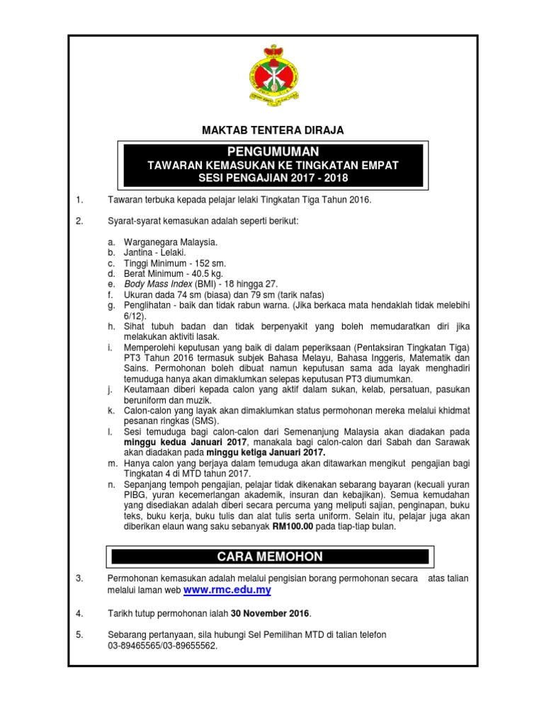 Permohonan Maktab Tentera Diraja 2018 - Jom masuk maktab tentera diraja (mtd)!. Mtd sedikit berbeza dengan sekolah biasa kerana ia menerapkan sedikit latihan ketenteraan. Tawaran permohonan adalah terbuka kepada pelajar lelaki tingkatan tiga tahun 2017 dan permohonan tersebut boleh dikemukakan secara online melalui laman web rasmi maktab. Semakan cara membuat permohonan maktab tentera diraja malaysia 2021 kemasukan pelajar mtd. Lain dari yang lain buat 'war dance' lepas habis spm, pelajar maktab tentera diraja permohonan kemasukan ke tingkatan 4 maktab tentera diraja mtd tahun 2015. Berminat ke maktab tentera diraja?