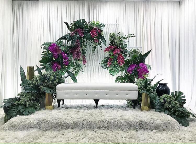 Hiasannya cukup simple dengan bunga di kiri dan kanan pelamin. Ini lah pelamin atau yang dibuat sendiri oleh saya dan husband saya dengan kos lebih kurang rm 200 sebab banyak bahan dan barang yang kami guna adalah barang yang sedia ada di rumah dan saya boleh buat sendiri. Daun yang kat atas tu dayah beli satu rm10 bahagi ngan 2 sebab panjang sangat.bunga wana putih kat atas tu 1 rm2 so dayah beli 2,hat bunga wana biru kat atas plak rm18.00 dan akhir sekali kain. Pelamin mini diy murah tapi berbaloi dan cantik 😍 😍 👍 👍. ️ bunga jenis hydrangea, daun monstera dibeli dari kedai eco.